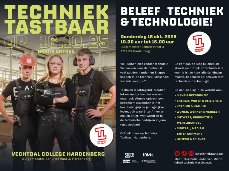 Op donderdag 16 oktober 2025 organiseren we op Vechtdal College Hardenberg namens Sterk Techniekonderwijs Techniek Tastbaar: een inspirerend doe-evenement voor vmbo-leerlingen uit leerjaar 1 t/m 4. Gedurende de schooldag zullen de leerlingen het evenement bezoeken, ouders/verzorgers zijn van harte welkom.