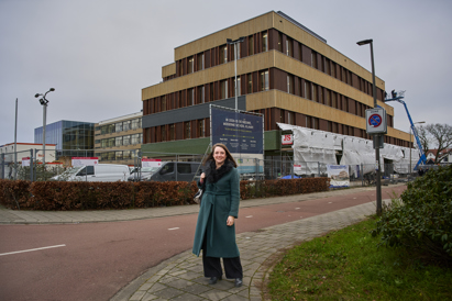 Op het moment van het interview is de nieuwbouw nog afgesloten, dus we maken een rondje om de bouwplaats, op een steenworp afstand van het NS-station. Het waait flink en in de schaduw is het nog fris, maar Marianne lijkt er geen last van te hebben.